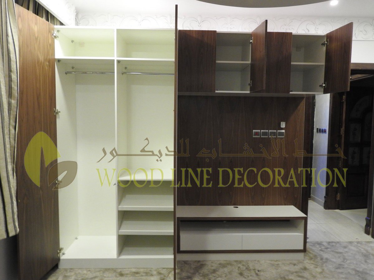 خط الأخشاب للديكور No Twitter خزانة جدارية مع مكتبة تلفزيون مصنوعة من خشب Mdf مع تلبيس قشرة الجوز الفاخر ديكور خشب بيت العمر تصيم