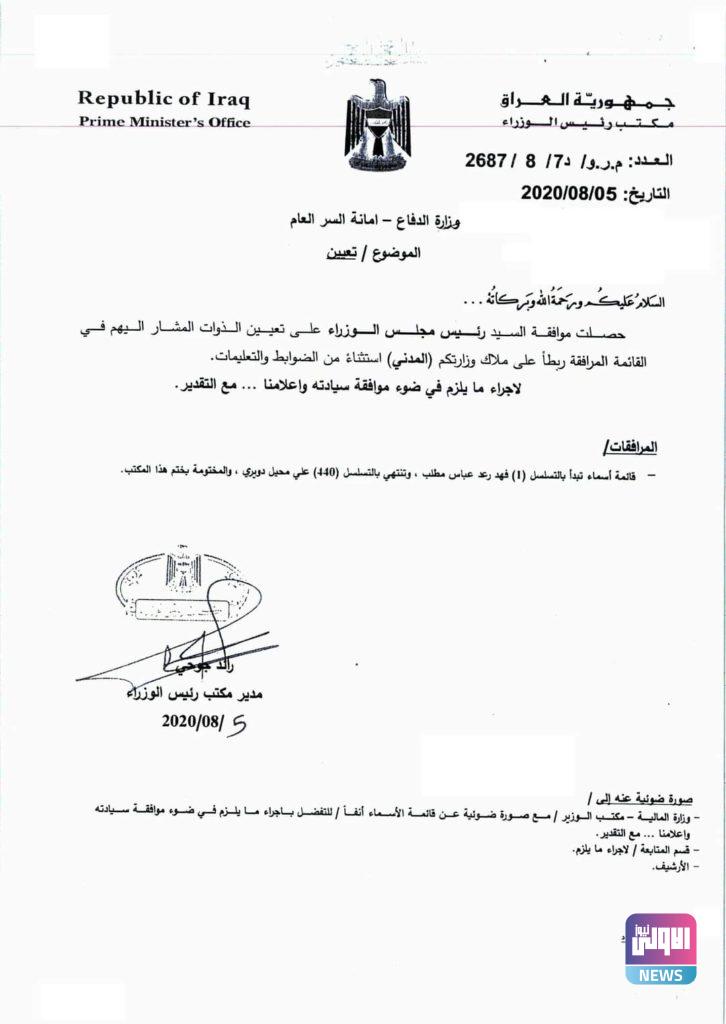 الدفاع تنشر اسماء ٤٤٠ من المشمولين بلتعيين في قوائم رئاسة الوزراء وثيقة وكالة الاولى نيوز