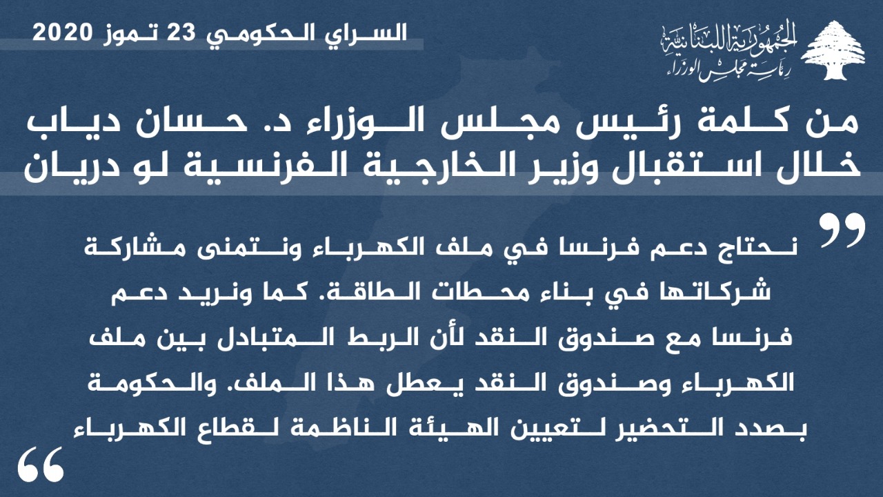 O Xrhsths رئاسة مجلس الوزراء Sto Twitter الرئيس دياب خلال لقائه Jy Ledrian نعمل بالرغم من العراقيل وأقرينا التدقيق الجنائي الذي سيطال مرافق عامة لدعم الإصلاح نطلب مساعدة فرنسا في تسريع المفاوضات