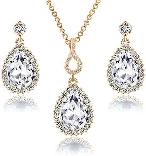أقراط كريستال سواروفسكي للنساء من Evevic قلادة على شكل دمعة مطلية بالذهب عيار 14 قيراط مجموعة مجوهرات لا تسبب الحساسية Gold Plated Brass ابيض Amazon Ae