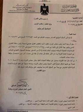 بالوثائق امانة مجلس الوزراء تدعو وزارة النقل الى الغاء امر نقل رئيس سلطة الطيران المدني وكالة الاولى نيوز